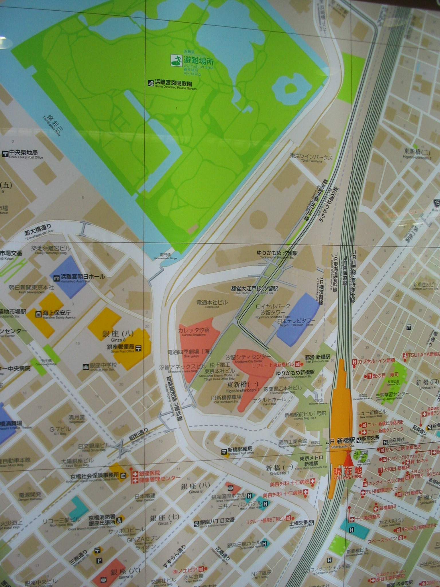 Our last sight of the day was the Hama Rikyu garden, walled off from the Sumida River. While I wasn’t as impressed with it as I was by the gardens in Kyoto or at the Meiji Shrine, I enjoyed the green respite from the busyness of the train station we’d just come from. We got lost on the way to the garden and had to return to that station in order to look at the map one more time. (In fact, we took a picture of the map in the station before leaving; Tokyo is a maze, and doesn’t always cater to the non-kanji-reading foreigner.)