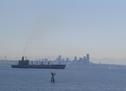 View from ferry; military freighter in foreground